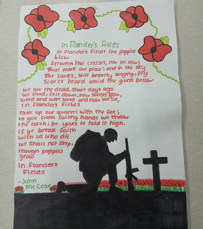 A huge shout-out goes to Caitlin and Abbie for the beautiful Remembrance Day artwork they created. Their commitment and sensitivity demonstrate the fantastic abilities within our group—you are all stars!